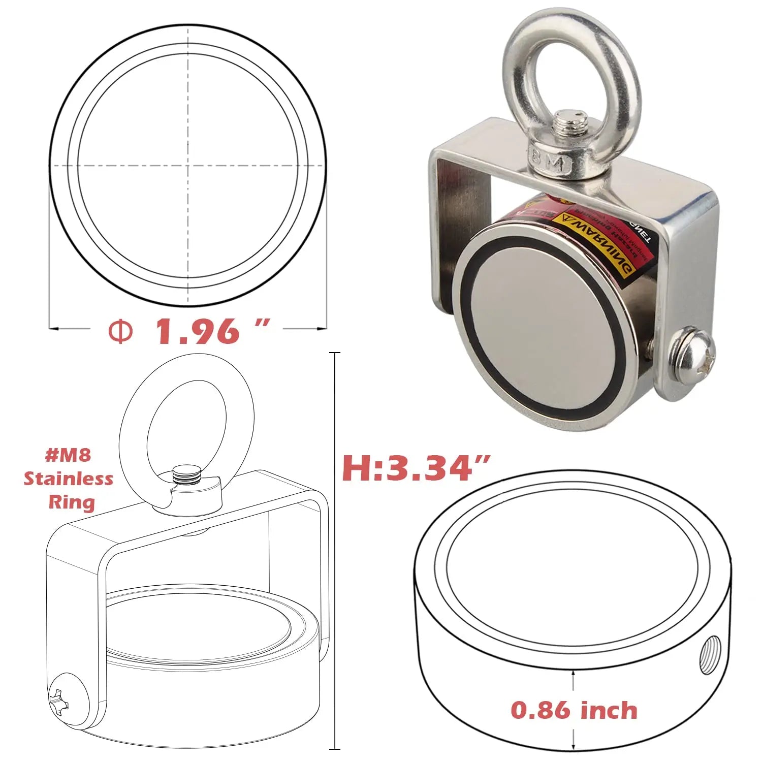 D50mm Fishing Magnet: Max 300lbs vertical magnetic pullforce on base of 30mm thickness steel plate